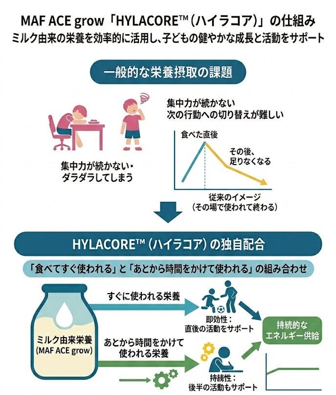 MAF ACE growでは、この点に着目し、ミルク由来の栄養を食べてすぐに体で使われるものと、あとから時間をかけて体で使われるものの2つに分けて組み合わせています。