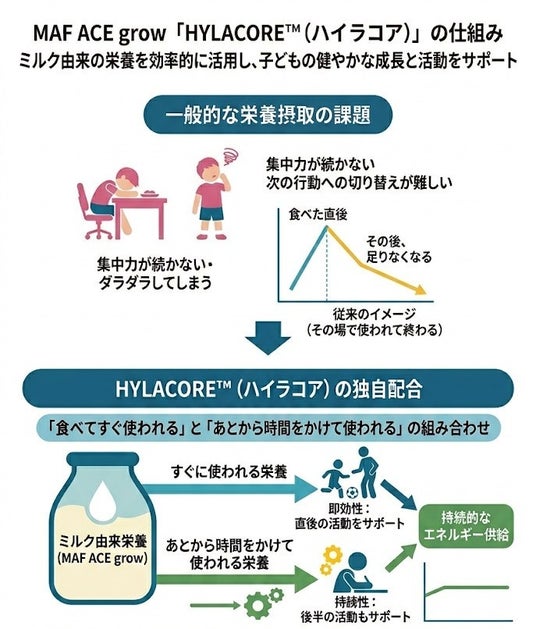 MAF ACE growは、こうした“日によって、うまく進む日と進みにくい日がある”という違いに着目して開発した商品です。特別なことを新しく始めるのではなく、家庭の中で無理なく続けられる形で、子どもの毎日を支えることを目指しています。