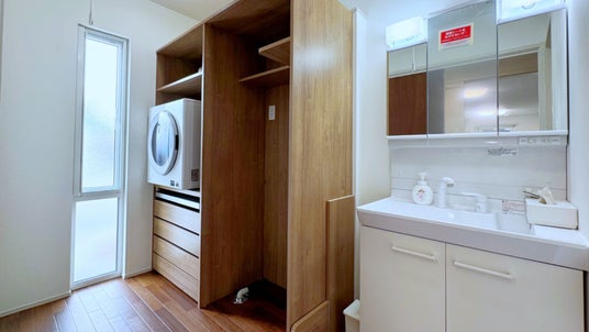 人気のガス乾燥機「乾太くん」を採用した洗面脱衣室は、洗う・乾かす・収納するが一か所で叶う家事ラク動線。