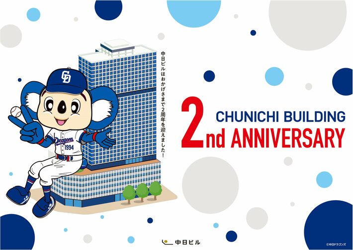 中日ビル(運営:中部日本ビルディング株式会社/名古屋市中区栄4-1-1、代表取締役社長 臼田信行)は、4月23日(木)に開業2周年を迎えます。この節目を祝し、当日は中日ドラゴンズの公式マスコット「ドアラ」をスペシャルゲストに迎え、華やかな「周年セレモニー」を開催いたします。