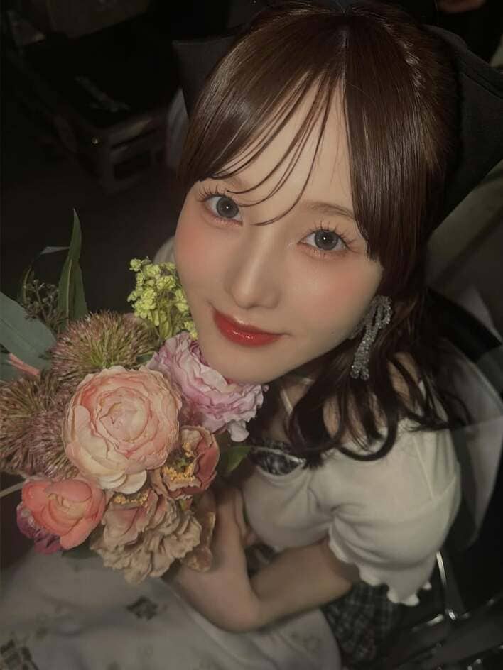 かわいらしいお花のブーケを胸に、潤んだ瞳でカメラを見上げた上目遣いショットは、思わずドキッとしてしまいます。