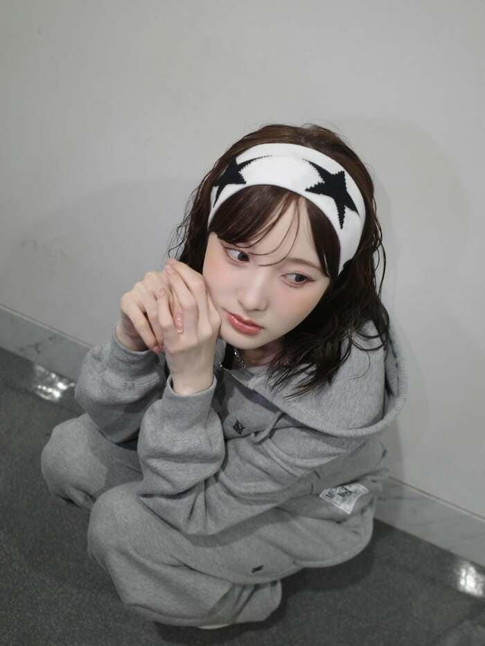まずは、頭に星柄のヘアバンドをつけ、上下グレーのスウェットに身をつつんだショット。本田さんは壁を背にしてしゃがみ、両手の指を組んだポーズで遠くを見つめていて、透明感あふれる肌が印象的です。