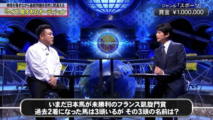 第3問:いまだ日本の馬が未勝利のフランス凱旋門賞。過去2着になった馬は3頭いるがその3頭の名前は?(正解は「エルコンドルパサー、ナカヤマフェスタ、オルフェーヴル」)