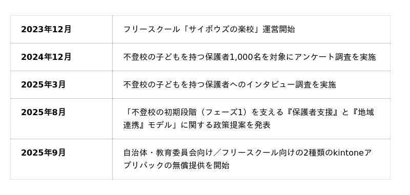 「チームワークあふれる社会を創る」をパーパスに掲げるサイボウズは、2023年より吉祥寺にてフリースクール「サイボウズの楽校」を運営し、子どもたちへの教育に取り組んでいます。不登校の子どもを持つ保護者の支援や自治体との連携、kintoneを活用した運営DXなど、企業ならではの視点でこどもの居場所づくりを実践してきました。本ホワイトペーパーは、その実践知をもとに作成されています。