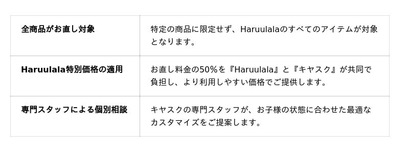 その第一歩として、お直し費用の50%を『Haruulala』と『キヤスク』の両社で負担いたします。