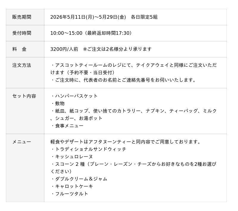 1994年の設立から110万人以上の来訪者を誇るブリティッシュヒルズ(福島県天栄村)は、2026年5月11日(月)~5月29日(金)各日限定5組にて、英国式ピクニックを気軽に楽しめる「ピクニックハンパー」を販売いたします。本セットには、アスコットティールームにて提供している英国式アフタヌーンティーと同等のメニューのほか、ピクニックに欠かせない「ハンパー(かご)」や敷物、カトラリーなどがセットになり、手ぶらで本格ピクニックが楽しめます。高原の清らかな空気に囲まれたブリティッシュヒルズで、初夏の優雅なひとときをお過ごしください。