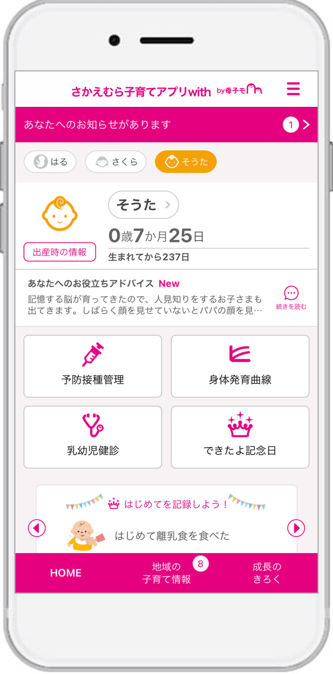 栄村に採用された『さかえむら子育てアプリwith』は、スマートフォン・タブレット端末・PCに対応したサービスで、妊産婦と子どもの健康データの記録・管理や予防接種のスケジュール管理、出産・育児に関するアドバイスの提供、離れた地域に住む祖父母など家族との共有機能や、村が配信する地域の情報をお知らせするなど、育児や仕事に忙しい母親や父親を助けてくれる便利な機能が充実しています。