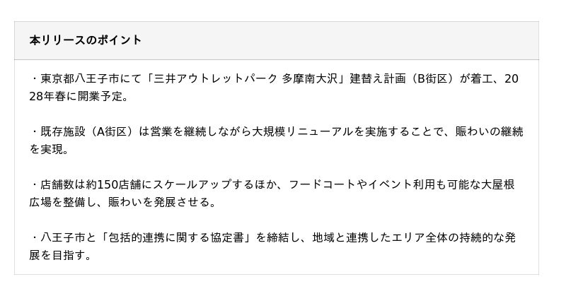 三井不動産株式会社(所在地:東京都中央区、代表取締役社長:植田 俊)は、東京都八王子市にて運営する「三井アウトレットパーク 多摩南大沢」における建替え計画(B街区)について、今般、建築工事に着手したことをお知らせいたします。なお、開業は2028年春を予定しています。