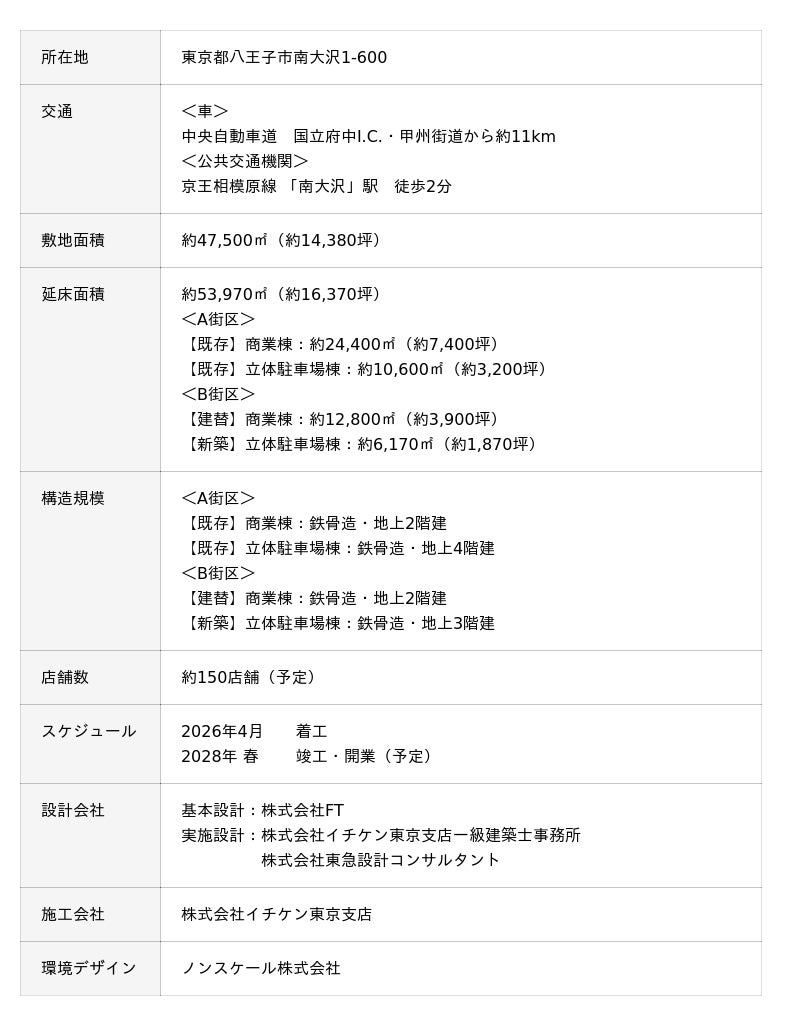 現在、南大沢駅周辺では八王子市により本施設へのメイン動線となる歩行空間や南大沢中郷公園の再整備を通じて、公共空間の質を高めるための検討が進められています。当社は、本事業とハード・ソフト両面で緊密に連携することで、単なる商業施設の更新にとどまらない、エリアの魅力向上に向けたまちづくりを推進してまいります。