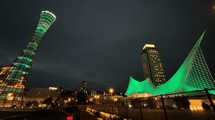 3.ホテルオークラ神戸は初のGREENライトアップ!神戸ポートタワー、神戸海洋博物館神戸市立博物館もGLION ARENA KOBEと共にGREENライトアップでお祝い!