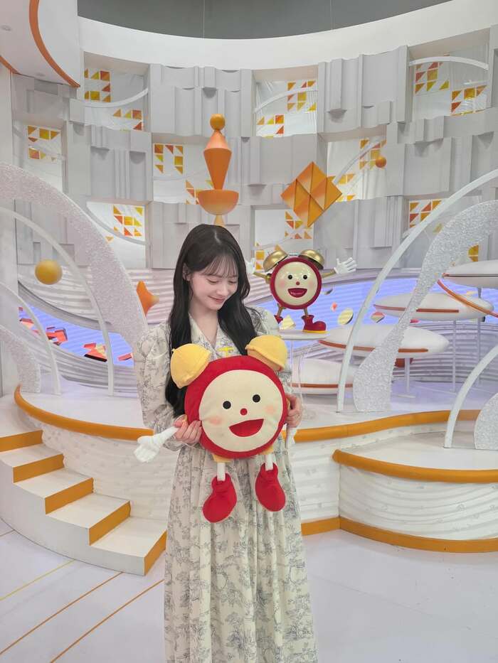 めざましくんの大きなぬいぐるみを抱き、カメラに向かってにっこり笑顔を見せる伊藤さん。その表情はとっても爽やかで、朝にぴったりなフレッシュな雰囲気が漂っています。