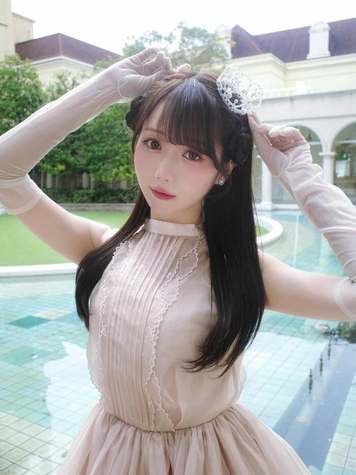 噴水のある美しい庭園を背景に、淡いピンクのドレスとロンググローブを身にまとった大谷さん。頭にはティアラを乗せ、両手をふわりと頭上に掲げる姿は、まるでおとぎ話から抜け出してきたかのような気品にあふれています。