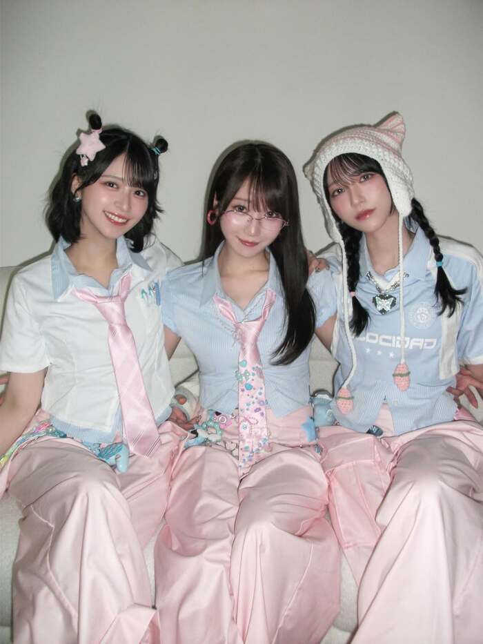 淡い水色のシャツにピンクのパンツを合わせたお揃いコーデで、大谷さんは知的な眼鏡姿で中央に座り、両脇の2人の腰に手を添えて微笑みます。佐々木さんは歯を見せてにこやかに笑い、野口さんはアゴを軽く上げてクールな視線を向けるなど、三者三様の表情で圧倒的なビジュアルを見せています。