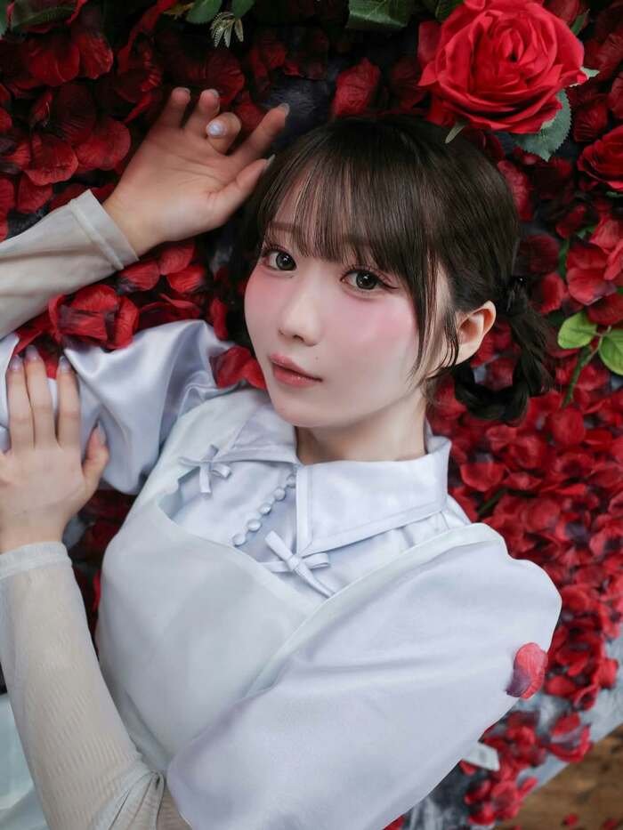 さらに、深紅の花々に囲まれたアップショットでは、右手を顎に添えた仕草と、ほんのりと頬を染めた表情が印象的。どこか憂いを帯びたような艶やかな眼差しに、思わずため息が漏れてしまいそうです。
