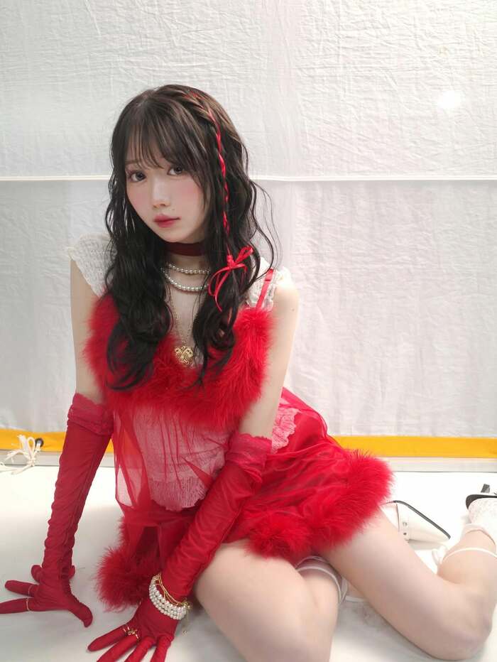 ジャケット写真のオフショットでは、真っ赤なファーをあしらった衣装で登場。黒髪には赤いリボンが編み込まれ、チュールやパールのネックレスが華やかさを引き立てています。床に手をつき、少し身を乗り出すようなポーズとスラリと伸びる美脚に、ドキッとさせられる一枚です。