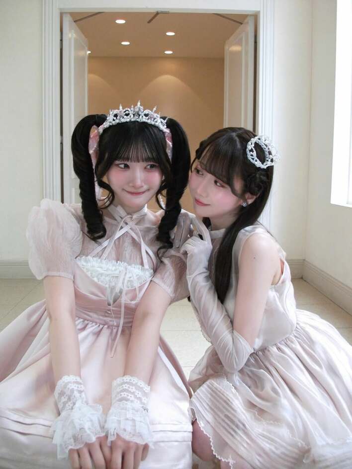 さらに、この楽曲でセンターを務める齋藤樹愛羅さんとの2ショットも披露。淡いピンクとオフホワイトのドレスにレースやフリルがたっぷりとあしらわれ、まるで妖精のような可憐さが漂います。大谷さんが誘惑するような視線で顔を寄せると、齋藤さんが少し困惑したような表情を見せるなど、微笑ましいやり取りも印象的です。