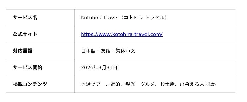 琴平バス株式会社(本社:香川県仲多度郡琴平町、代表取締役:楠木 泰二朗)は、旅行者が琴平町での滞在中に楽しめる体験・ツアーをワンストップで一覧・予約できる地域観光プラットフォーム「Kotohira Travel」を、2026年3月31日から始動します。