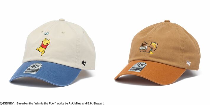 本作では、ちょうちょを追いかける「プーさん」の姿を表現したデザインと、「プーさん」が大好きなはちみつをモチーフにした2種を展開。キャラクターの魅力を刺繍で表現し、’47らしい落ち着いたトーンの配色で仕上げています。