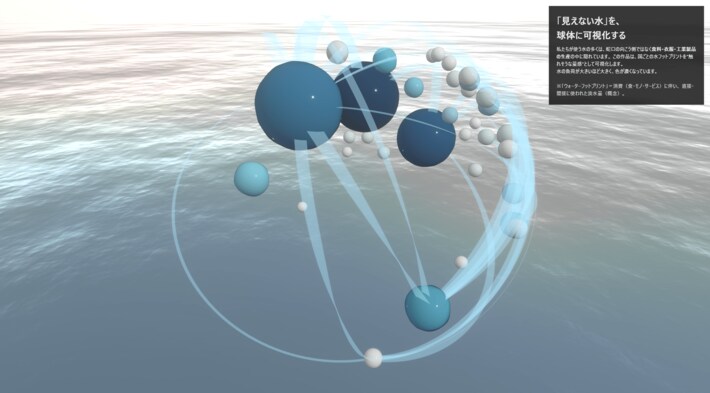 私たちが日常で使う水の多くは、蛇口の先ではなく、食料・衣服・工業製品の生産過程に隠れています。本作品は、国ごとの水フットプリント(製品の生産に使われる水の総量)を球体として可視化しています。水の負荷が大きいほど球体は大きく、色が濃くなります。数字では伝わりにくい「見えない水」の存在を、身体感覚に近いかたちで問いかけます。