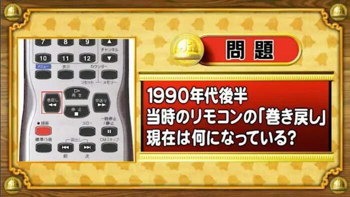 最後は、変わりゆく名称の問題。今からおよそ20数年前の1990年代後半。当時のリモコンの「巻き戻し」、現在は何になっているでしょうか?