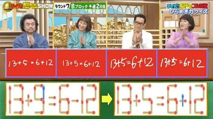 正解はまず、左の式の「9」から右上の1本を動かし「5」にします。その1本を右の式の「-」に足して「+」にします。そうすれば「13+5=6+12」となります。全員正解です。