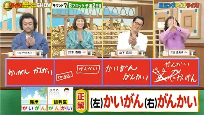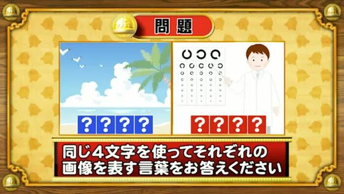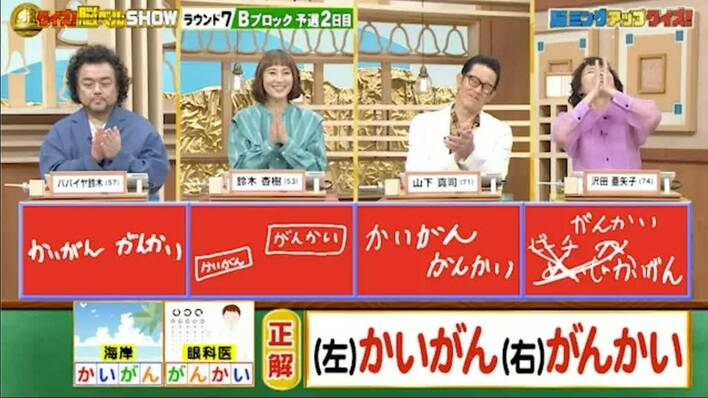 正解は「かいがん(海岸)」と「がんかい(眼科医)」。全員正解。