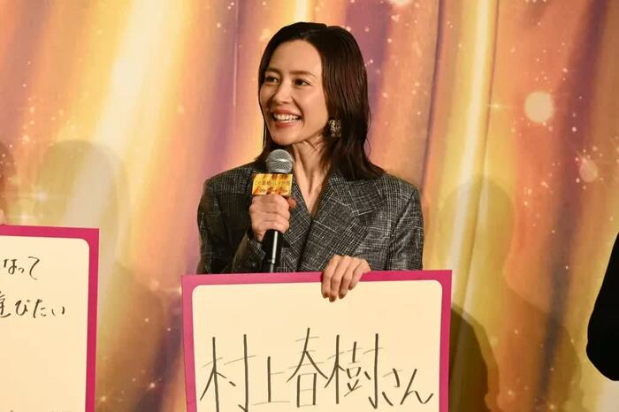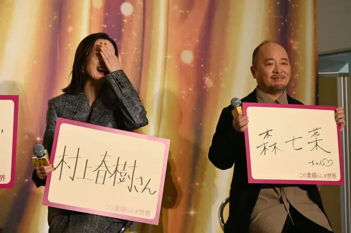 木村さんは「村上春樹さん」。実は「学生の頃、新刊が出ると紀伊國屋書店に並んでいました」と、“ハルキスト”だという木村さん。「先日、『海辺のカフカ』の朗読をさせていただいたのですが、(普通に読むのとでは)また違った世界を感じ、もっと好きになりました」と話し、「村上春樹さんになってどんどん新作を書きます!お待ちください」と、ノリノリ。