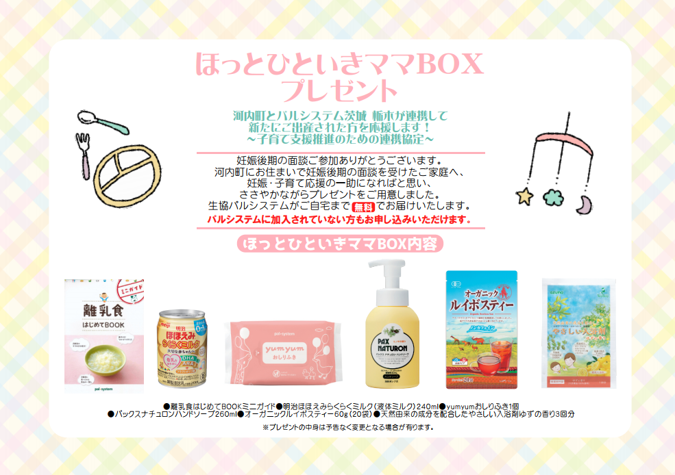 協定書に基づき河内町は、「妊娠後期面談」時に、町からの妊娠と子育てを応援するプレゼントとして「子育てに役立つ商品(ほっとひといきママBOX)」を届ける案内カードを配付します。プレゼントは、母体をいたわる入浴剤やオーガニックティー、パルシステムオリジナル商品のおしりふきなどを詰め合わせます。