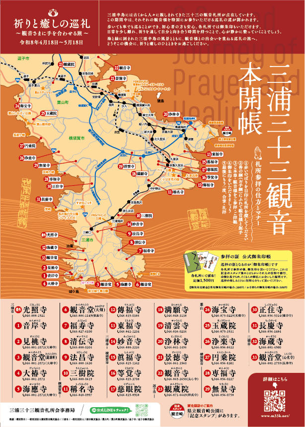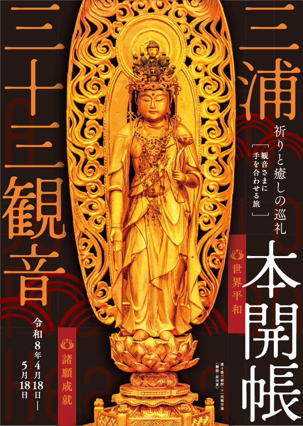 ~ 祈りと癒しの巡礼 観音さまに手を合わせる旅 ~ 三浦三十三観音札所会は、令和8年(2026年)4月18日(土)から5月18日(月)の31日間にわたり、「三浦三十三観音 本開帳」を開催いたします。