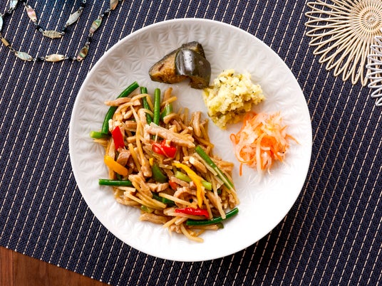 副菜は、高菜入りのポテトサラダ、あっさりとした大根の塩だれ、揚げることでコクがアップしたなすの生姜醤油です。食感や大きさの異なるメニューを組み合わせ、一皿の中での変化を楽しめる構成に仕上げています。