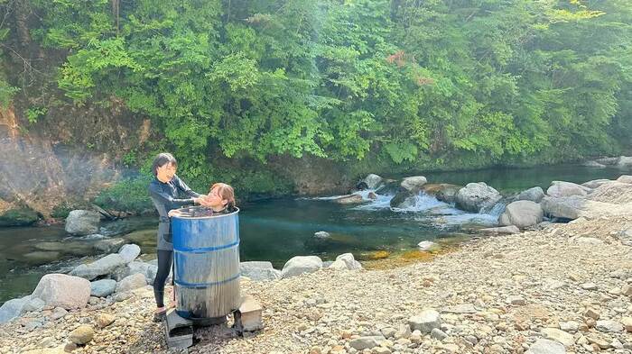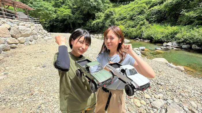 河原でも、さまざまなアクティビティを満喫!ドラム缶に川の水を運んで超ワイルドな入浴タイムを楽しみ、自然の景観を生かしたラジコンコースで激熱バトルも!?