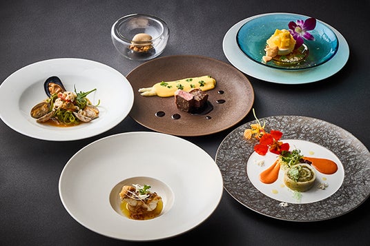 前菜では、旬の味覚を繊細に表現した旬穴子をご用意いたします。穴子に香ばしくローストした茄子を纏わせロール状に仕立て、パプリカのクーリを合わせました。相性の良いきゅうりの氷菓とともに、レモンの爽やかな香りが全体を引き立てる、軽やかな一皿です。パスタは魚介の旨みを凝縮したペスカトーレを翡翠色のタリエリーニでお楽しみください。富山県産白海老やムール貝、あさりの旨みを重ねたビアンコ仕立てで、白海老の濃厚な甘みとコクが優しく広がります。魚料理は旬のキジハタをふっくら蒸して、香味葱油と特製XO醤をフレンチ風にアレンジしたオリジナルソースで仕上げました。お口直しには梅のソルベをご用意し、さっぱりとした余韻でコースに軽やかなアクセントを添えます。肉料理は上品な旨みとやわらかな肉質が魅力の“エゾ鹿ロースのポワレ 柚餅子ソース“、または”黒毛和牛ロースのポワレ特製 生姜風味ソース“の2種類からお選びいただけます。デザートは宮崎マンゴーとエキゾチックフルーツを合わせた、南国の香り広がる爽やかなパルフェをお楽しみいただけます。最後は小菓子とともに、優雅なひとときをお過ごしください。