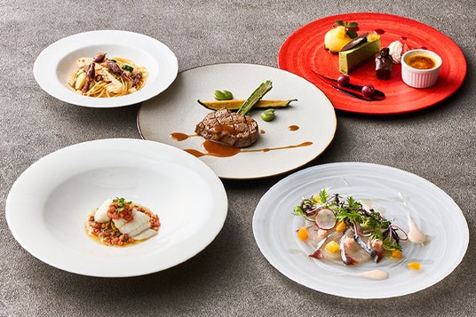 前菜はシマアジのカルパッチョを、旬の枇杷と赤玉葱とともにガリドレッシングでさっぱりと仕上げました。魚料理は、ふっくらと蒸し上げたカレイにフルーツトマトのヴィネグレットソースを合わせ、爽やかな香りが引き立つ軽やかな味わいをご堪能いただけます。肉料理は、香ばしく焼き上げた牛サーロインのグリル、または黒毛和牛ロースのグリリアータ特製生姜風味ソースをご用意いたしましました。デザートはワゴンよりお好きなものを盛り合わせてご提供いたします。コースの締めくくりにふさわしい華やかな余韻をお楽しみください。