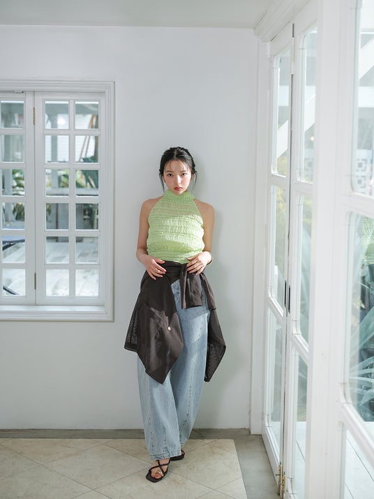 ナチュラルで透明感のある佇まいと、抜け感のある表現が魅力の田中さん。本カタログでは、みずみずしい空気感と光を感じるロケーションの中で、夏のはじまりを想起させるビジュアルを展開。田中さんのニュートラルな表情と自然体なポージングが、女性らしさの中にあるヘルシーな魅力を引き立て、LAGUNAMOONらしい洗練されたサマームードを体現しています。