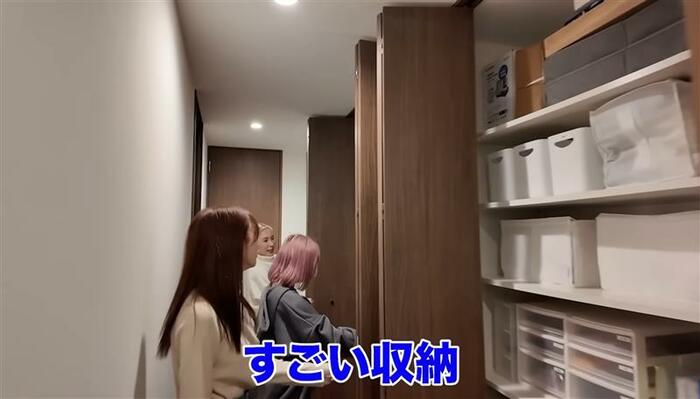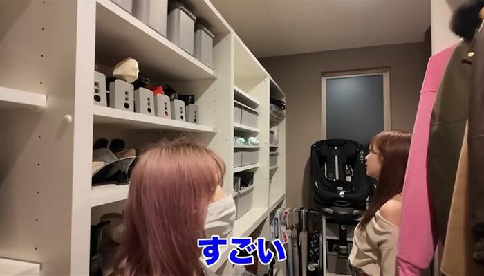 また、さおりんさんとまりなさんが「広っ!」と口をそろえて驚いた、シューズクローゼットエリアも披露!靴だけでなくファッションアイテムや備蓄アイテムなど、余裕を持って収納することができるようで、3人が入っても窮屈感がありませんでした。