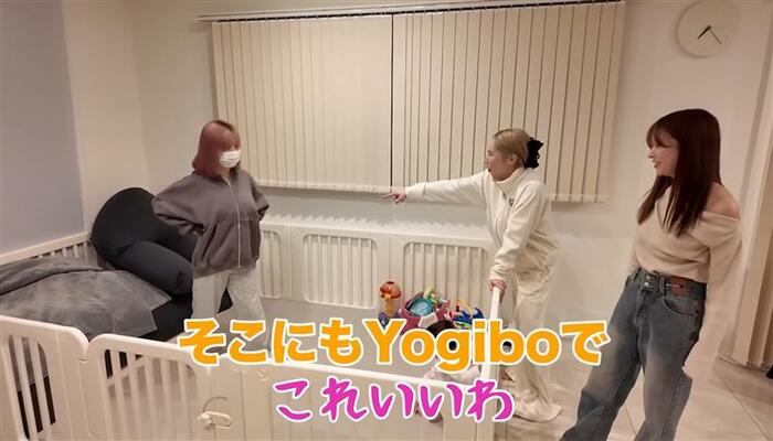 リビングには、柵で仕切られたキッズスペースが。エリア内にはYogiboが置いてあり、昼寝しちゃうこともあるんだとか。まりなさんは「これいいわ」と、開放的な空間に感心のようです。