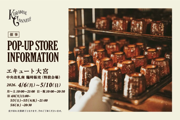 東京・蔵前にあるSNSで話題の焼き立てカヌレ専門店「KURAMAE CANNELE(クラマエカヌレ)」(運営:CLASSIC INC.、代表取締役 : 萱場俊克、本社 : 東京都渋谷区)は、2026年4月6日(月)~5月10日(日)の期間限定で、エキュート大宮にて出店いたします。