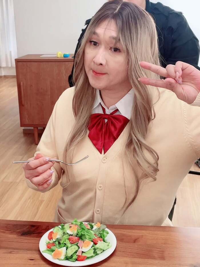 公開されたのは、ハイトーンのロングヘアを下ろし、白のYシャツに明るめのベージュカーディガンを重ね、胸元に赤色の制服リボンを身に着けた、女子高校生スタイルのほいけんたさんの姿。顔の横でピースする、おちゃめショットに仕上がっています。
