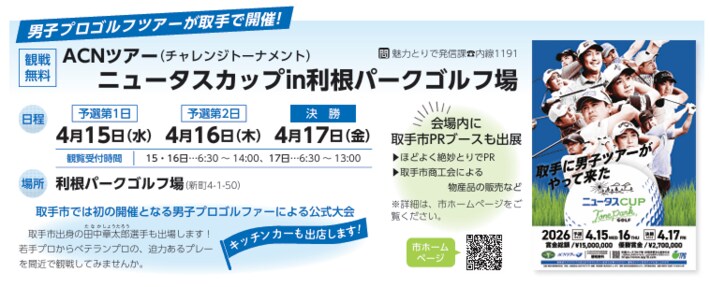 東日本振興株式会社(所在地:茨城県つくばみらい市)は、2026年4月15日(水)より、取手市内初となる男子プロゴルフ公式大会「第1回 ニュータスカップ in 利根パークゴルフ場」を開催いたします。本大会は、河川敷ゴルフ場でのプロトーナメント開催という国内初(※)の試みであり、地域の皆様と共に創り上げる「健康・生涯スポーツ」の祭典です。