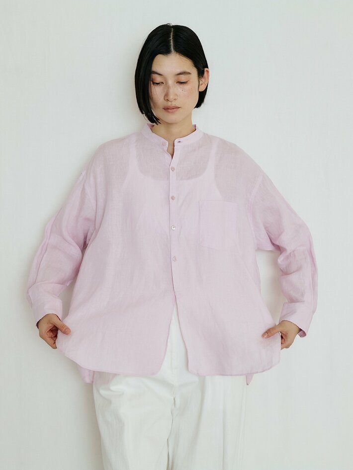 ブランドの定番として長く愛されている TICCA のノーカラーシャツはヴィンテージのディテールをベースに、削ぎ落とされたデザインの中にさりげないニュアンスを加え、モードな佇まいに仕上げています。一枚でさらりと着ても、羽織としても活躍する万能な長袖シャツ。デニムやワイドパンツに合わせたリラックススタイルはもちろん、タックパンツやスカートと合わせることで、上品で洗練された印象に。前を開けて軽く羽織れば、夏の日差しや冷房対策にも活躍します。シンプルだからこそ、着る人それぞれのスタイルに自然に寄り添う一枚です。