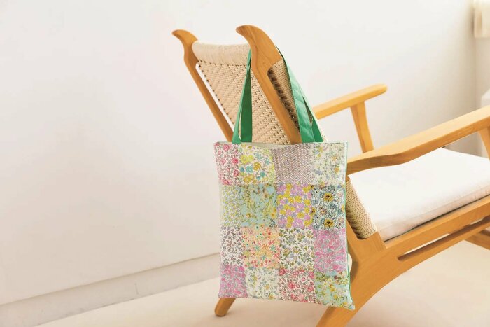 白のブラウスにデニムパンツを合わせた爽やかコーデでほほ笑む北川さんの手には、多種類のグリーンリーフの布を使った、パッチワークデザインのトートバッグが。初夏に映える手作りトートが、コーディネートとマッチしていて素敵です。