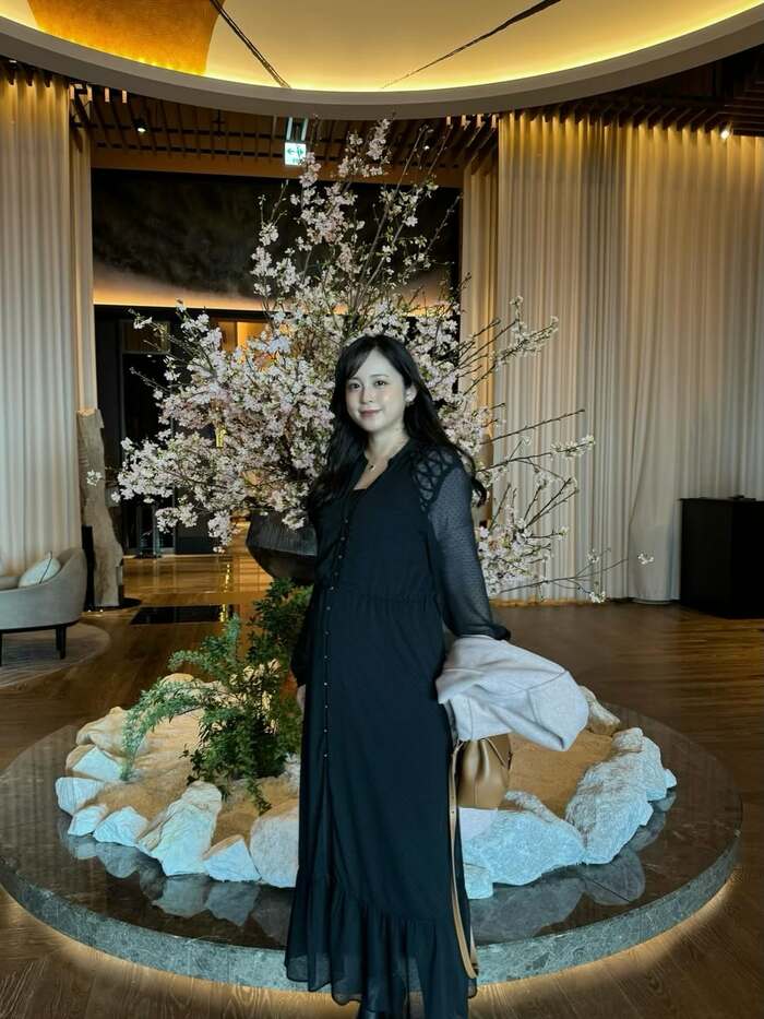 ゆったりとした黒のワンピース姿でたたずんでいます。腕周りの透け感のある素材や、高級感漂う室内に咲き誇る桜も相まって、エレガントな雰囲気があふれるカットに仕上がっていますね。