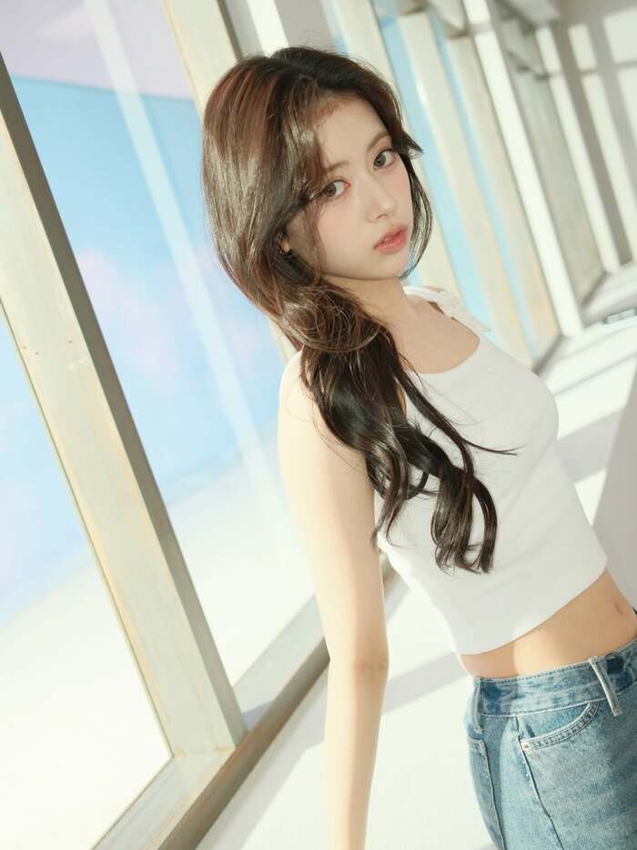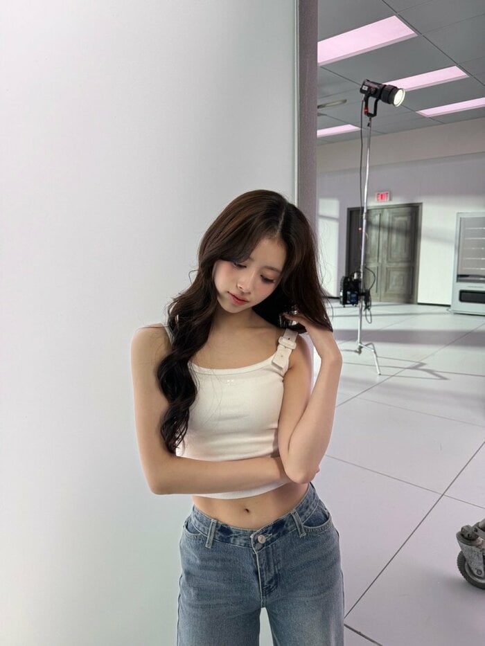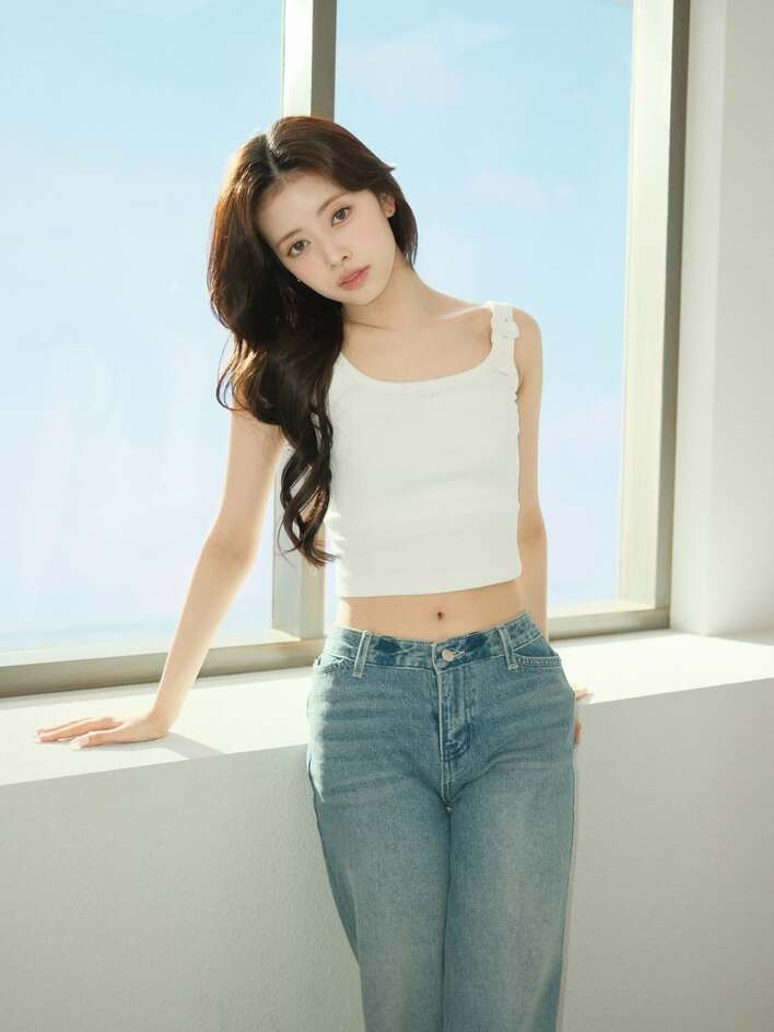 その写真を見てみると、おなか見せのショート丈の白いタンクトップにライトブルーのデニムパンツを合わせたシンプルなコーディネートで、窓辺のような場所でポージングするRIMAさんの姿が。