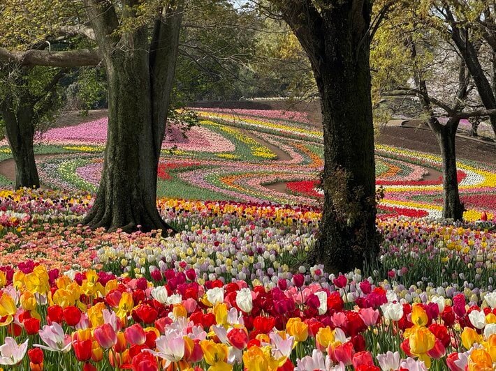 昨年までの規模では成し得なかった「チューリップいっぱいの花畑」が完成しました。四季の丘全体が24色のグラデーションに染まる様子は、ドローン空撮や高所からの引きの絵で、かつてないスケール感を演出できます。