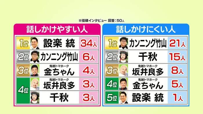 設楽さん、千秋さん、カンニング竹山さん、坂井さん、金ちゃんでは誰が一番話しかけやすく、誰が一番話しかけづらいかの街頭インタビューの結果も発表。