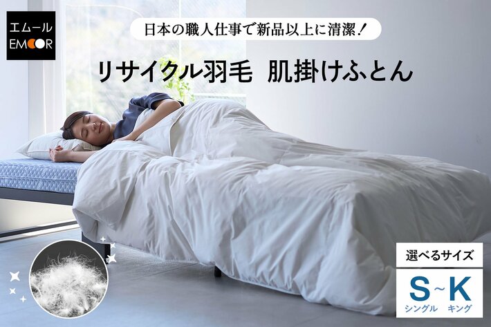 エムールの『リサイクル羽毛 肌掛けふとん』は、回収された羽毛を日本国内の丁寧な洗浄技術によってよみがえらせたリサイクルダウンを使用した肌掛けふとんです。目に見えない不純物やニオイまでしっかり取り除き、新品羽毛以上の清潔さとふんわりとした風合いを実現しました。資源を無駄にせず、心地よい眠りへとつなぐサステナブルな一枚です。