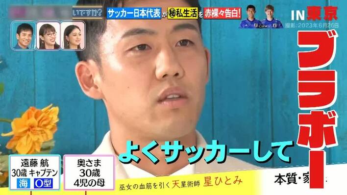 6歳の次男は「長友佑都選手とまったく同じ星」とのことで、遠藤選手は「よくサッカーして『ブラボー!』って言ってる」と話しました。