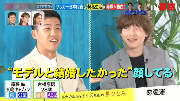 古橋選手は、「手足がスラッとした人に弱い」(星)、「“モデルと結婚したかった”って顔してる」(遠藤)と言われると、「おこがましいんですけど、やっぱり夢はあります」と、はにかみました。