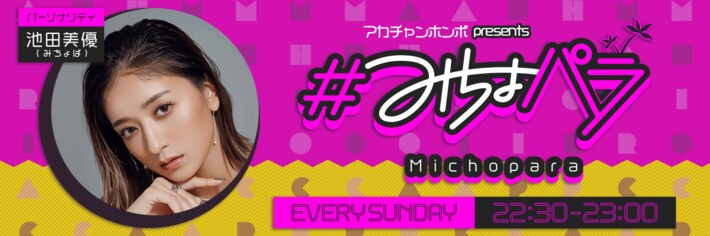 パーソナリティの池田美優(みちょぱ)さんは、今年2月に妊娠を発表。この度、妊娠・出産という人生の大きな節目を迎えるみちょぱさんをサポートする形で、4月から新たにアカチャンホンポの冠提供で『アカチャンホンポ presents #みちょパラ』のタイトルで放送いたします。