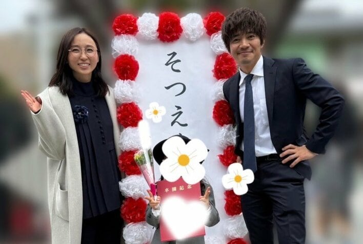 紅白のペーパーフラワーで縁取られた卒園式の立て看板を挟んで立つ、胸元にコサージュを着けた紺色のワンピース姿の吉木さんと、スーツ姿で腰に手を置く和田さん。夫婦そろって、にっこりと優しげな表情を浮かべています。